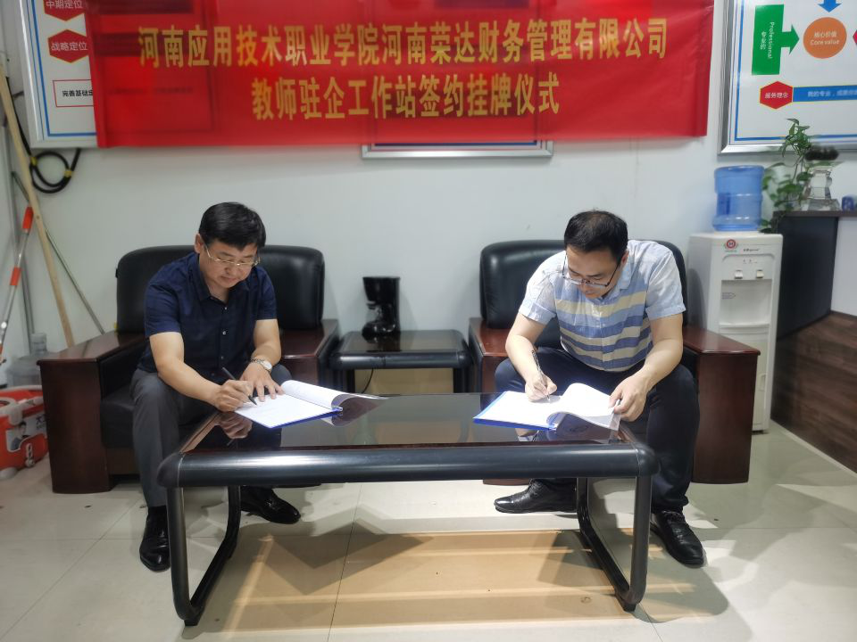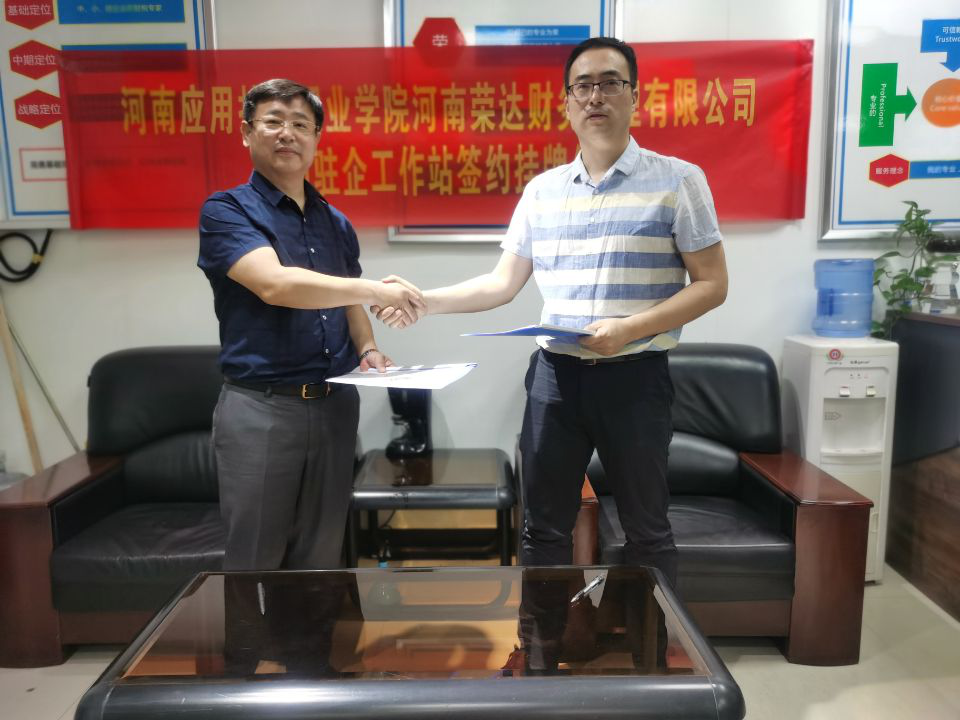 双方就如何有效依托“教师驻企工作站”开展人才培养、师资力量提升、服务地方经济等问题进行了深度探讨。随后澳门正规电子游戏平台张召哲院长和荣达财务管理有限公司总经理张春风分别代表校企签订了合作框架协议书,并在双方人员共同见证下为澳门正规电子游戏平台教师驻河南荣达财务管理有限公司工作站进行揭挂牌。