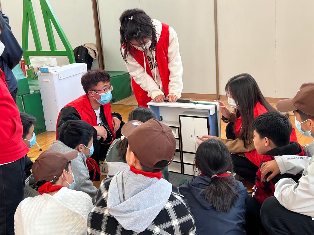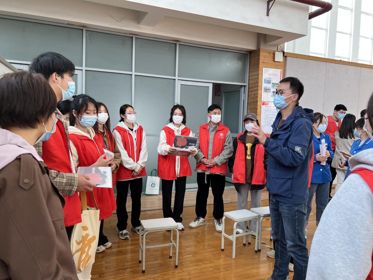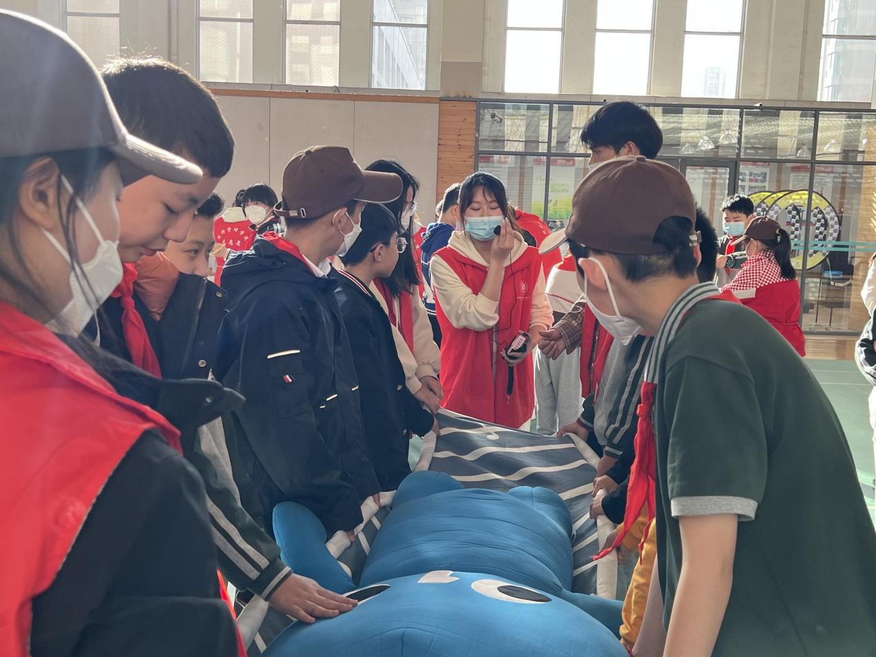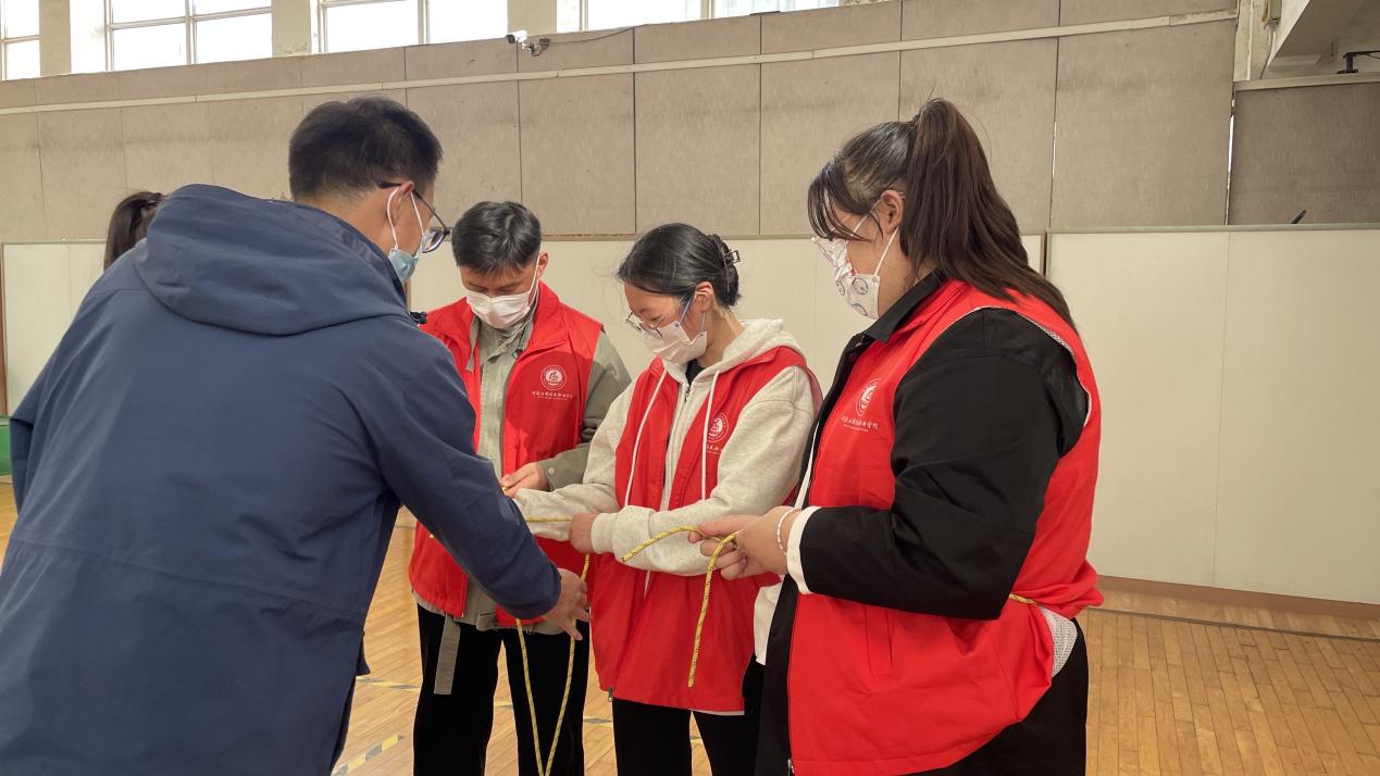 正式开展活动前,社工负责人吴陕南给志愿者们进行授课内容培训,包括毛毯担架计时赛、家具防倾倒、绳结大比拼等。同学们认真听讲,记下过会儿要教小朋友的项目要点。