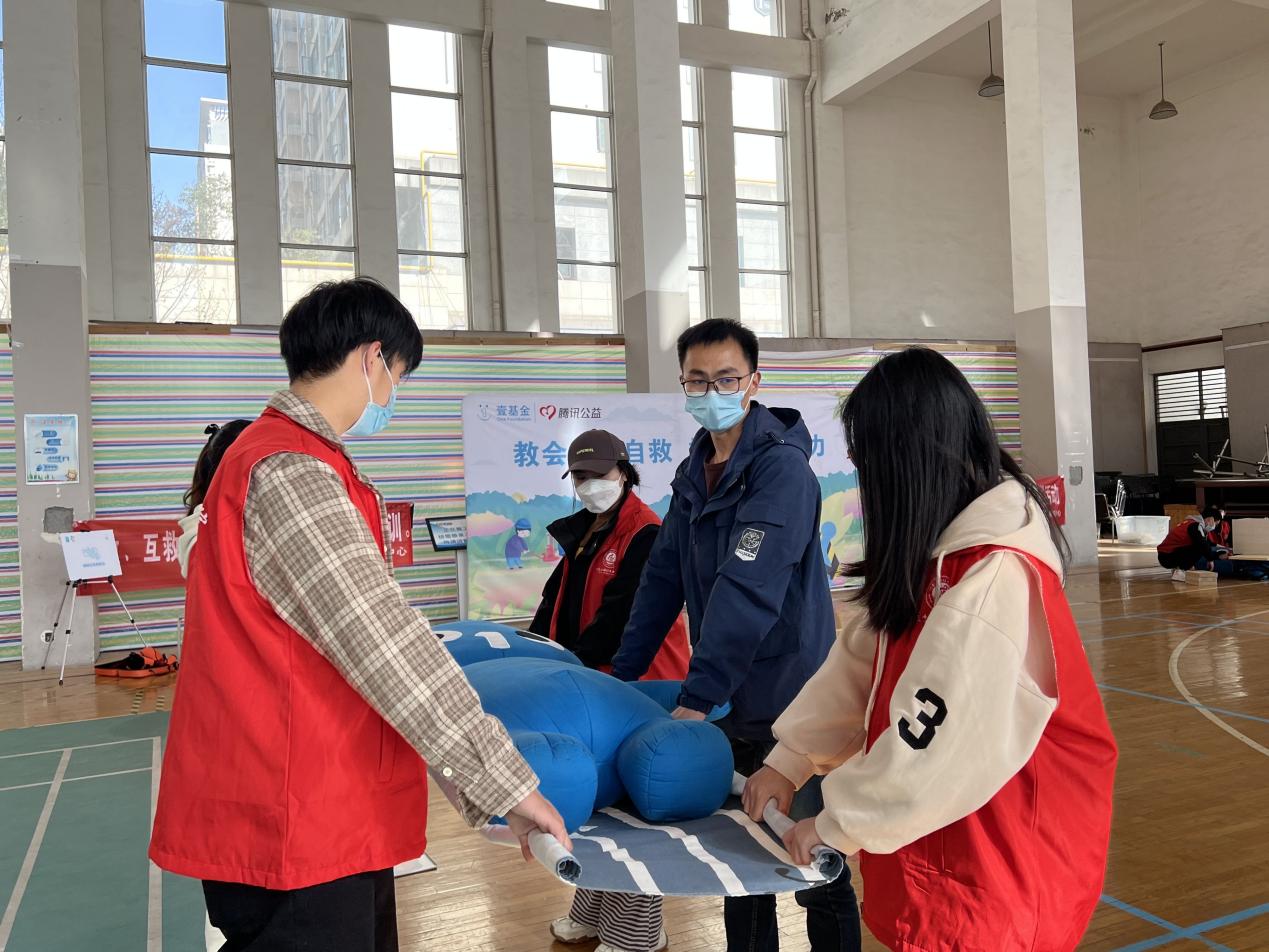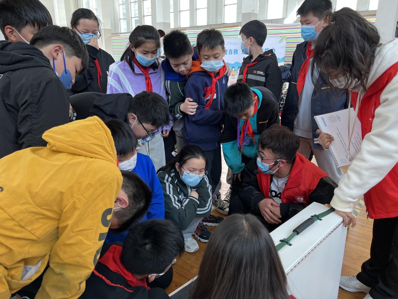 随着下课铃声响起,小朋友们向体育馆飞奔而来,等待一堂别样的课堂。志愿者们帮忙维持现场秩序。在分工分组之后,志愿者们现学现卖,把刚刚老师教的内容手把手教给交朋友,让小朋友在面临相似场景时,能够及时自救,提高生存能力。