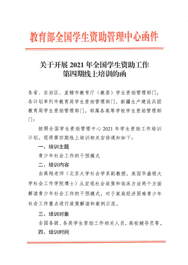 关于开展2021年全国学生资助管理中心第四期线上培训的函