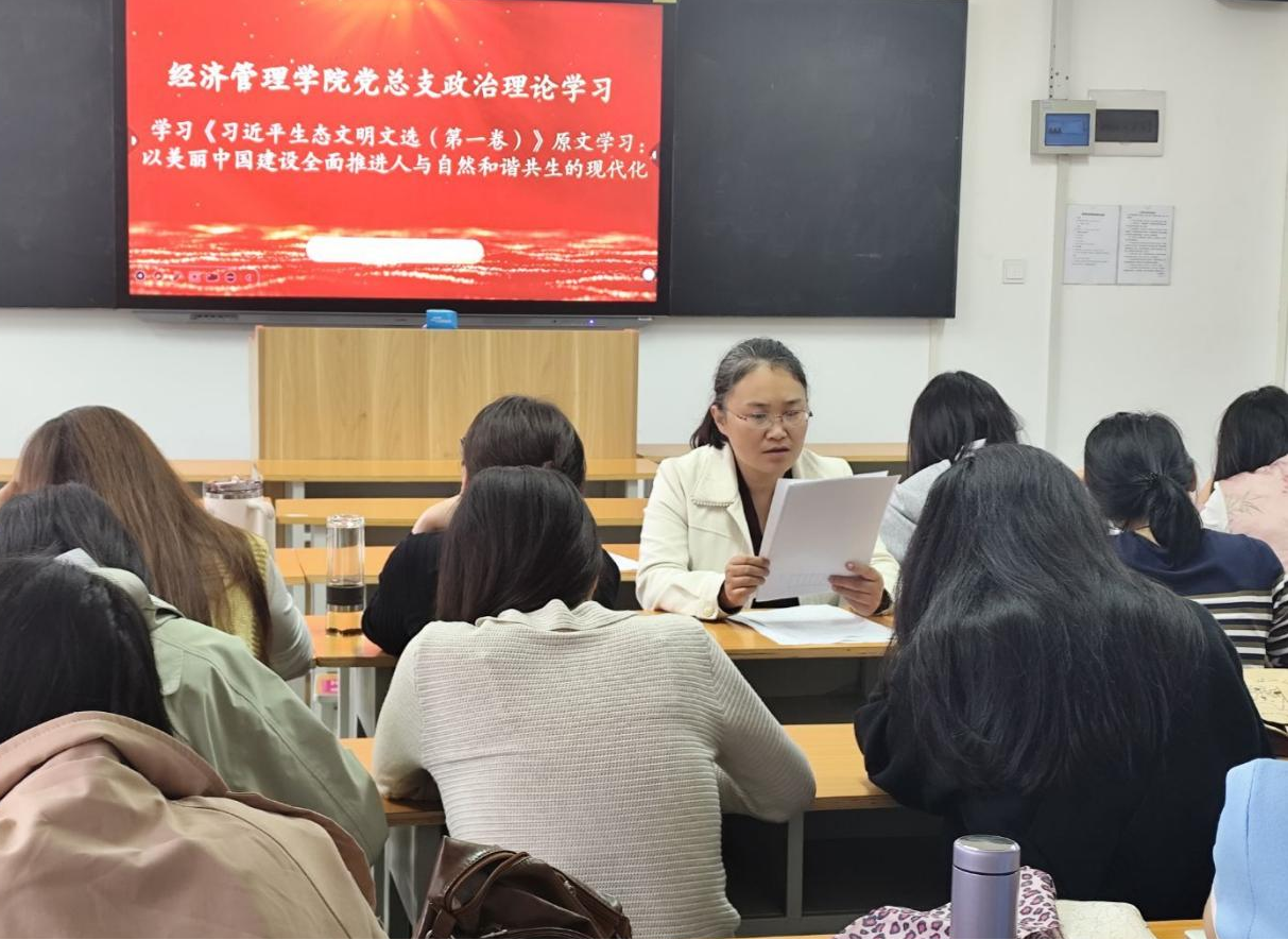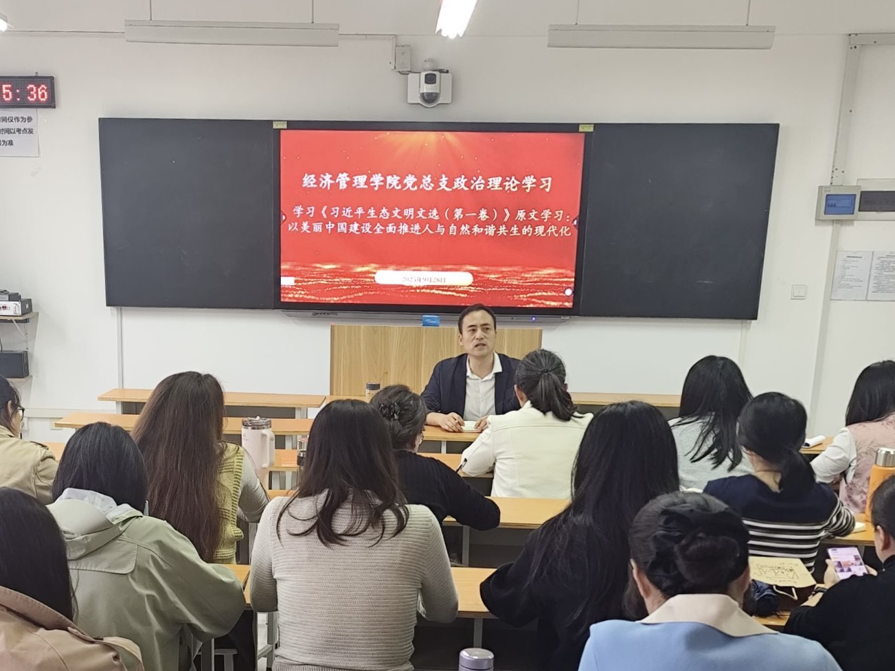 9月28日下午,澳门正规电子游戏平台党总支在E309组织召开专题政治理论学习会,深入学习领会习近平生态文明思想的丰富内涵与核心要义。本次会议由学院院长张召哲主持,学院副书记王盼红领学,学院全体教师参加。