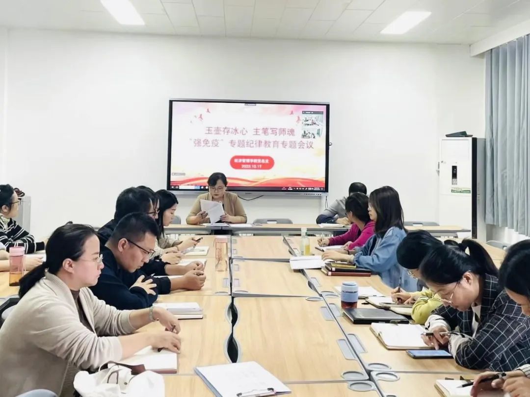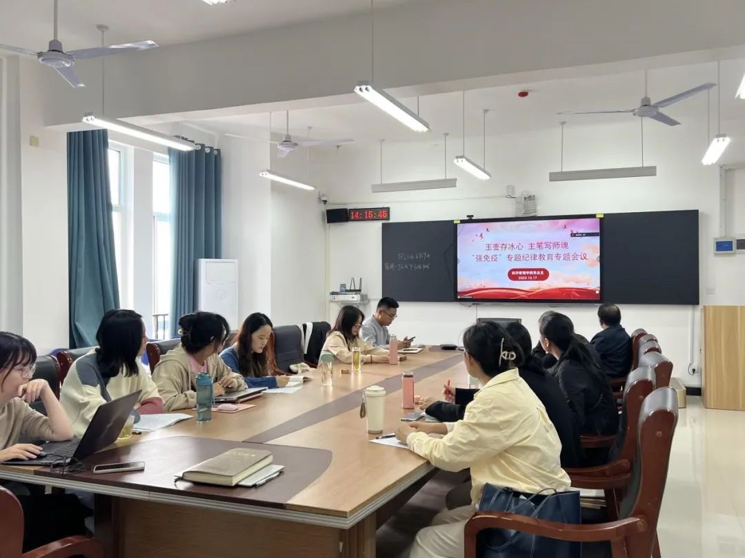 为深入贯彻落实党的二十大精神和习近平总书记关于严明党的纪律和规矩的重要论述,全面加强党的纪律建设,10月17日,澳门正规电子游戏平台党总支在郑州校区A505、开封校区B306同时召开2023年第四季度第一次“强免疫”专题纪律教育。书记李兆楠主持会议,全体党员教师参加学习。