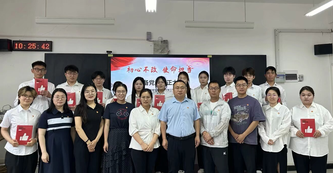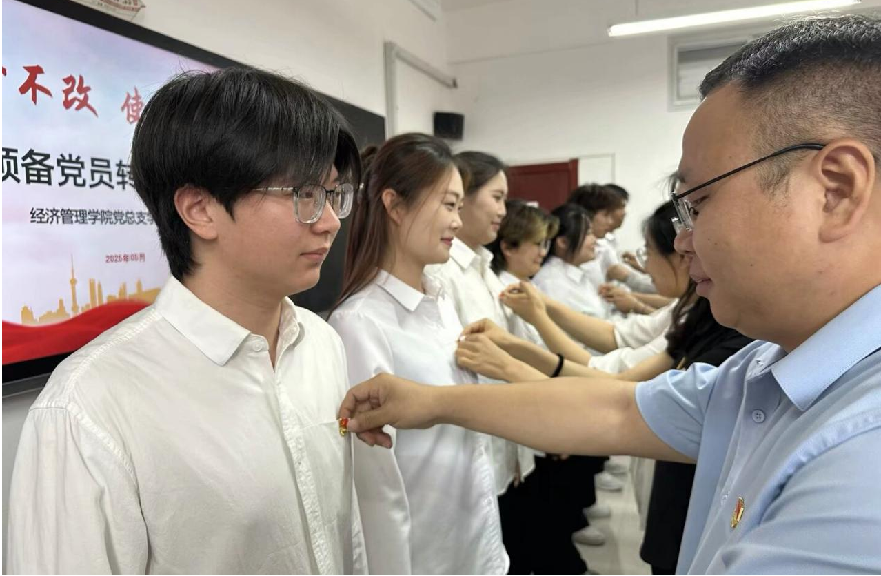 最后,培养教师为郜心甜等13名新党员佩戴党员徽章,张忠勇同志赠送书籍——《新时代中国青年的榜样》,并勉励大家:一要筑牢信仰根基,持续深化党的创新理论学习;二要强化责任担当,在专业技能提升和社会服务中争当表率;三要严守纪律红线,永葆共产党员先进本色。